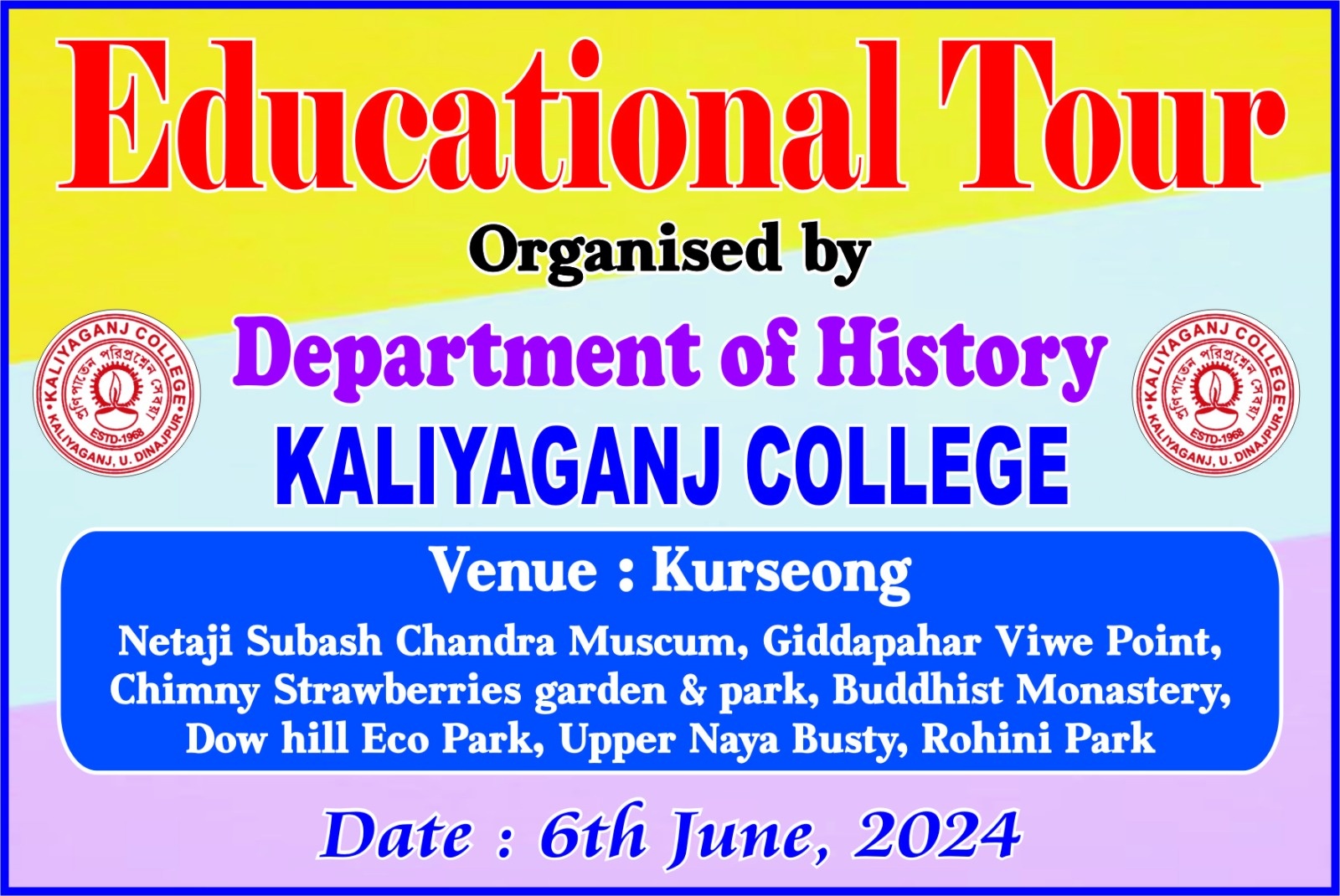 Kaliyaganj College arranges educational tours at regular intervals for its students from the department of History, Geography, Zoology, Botany etc. to get out of the classroom and gain real time education and experience to achieve academic enrichment. These tour is a part of their syllabus. Every student participating in the educational tour has to record the travel experience and submit it to the concerned department in the form of a report.